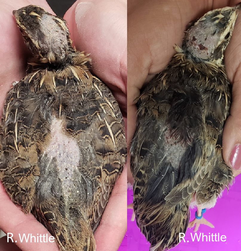 Figure 1: Quail hens with feather loss and scabs to the head due to male aggression and back from feather pecking.