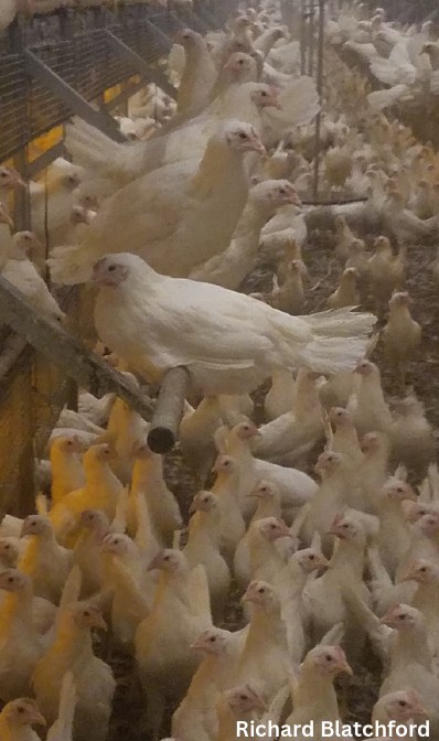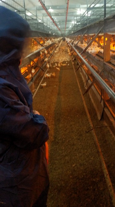 Pullets can be seen moving away from a person. This could be a cause of panic and smothering. The fear reaction can be lessened if pullets are accustomed to humans walking through the barn at a slow steady pace.