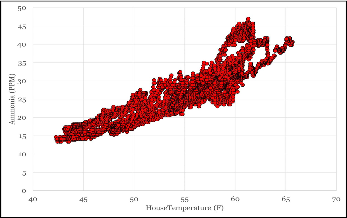 Figure 1. Ammonia concentration (parts per million) versus house temperature (oF)