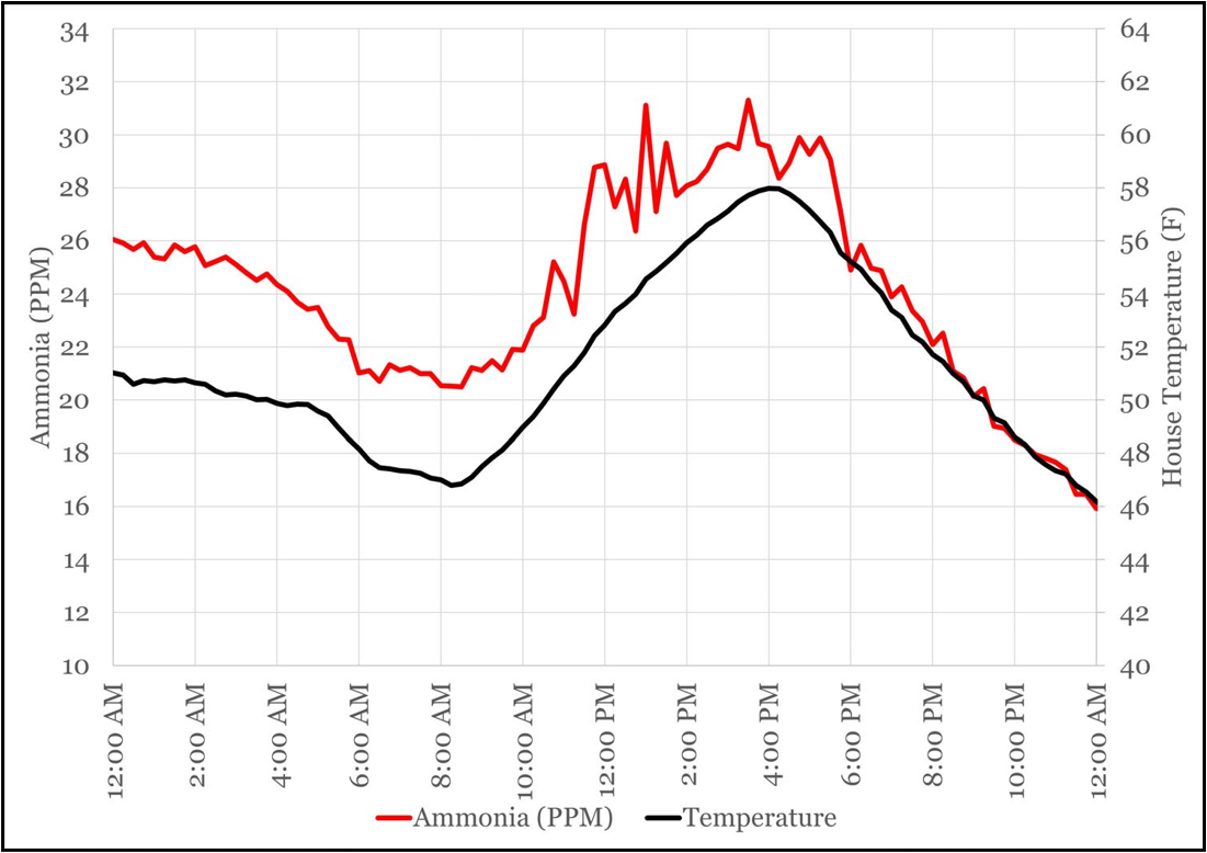 Figure 2. Ammonia concentration and temperature over 24 hours between flocks