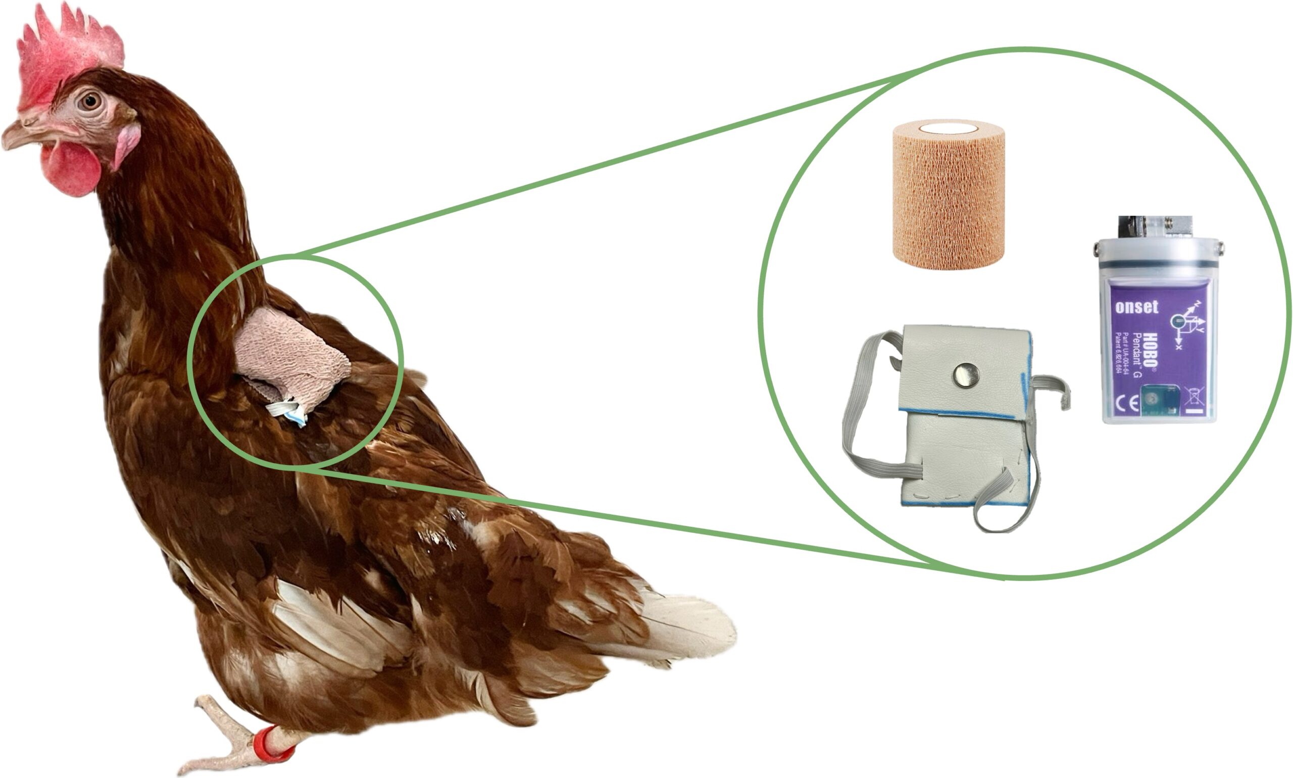 Activity levels provide insight into both physical health and behavioral needs. Animals that are injured or unwell often move less or show abnormal patterns, while healthy animals exhibit regular activity rhythms.2,3,4,5 To measure activity, we fitted hens with small accelerometers in custom backpacks to track horizontal (forward-backward) and vertical (up-down) movement (Figure 1).