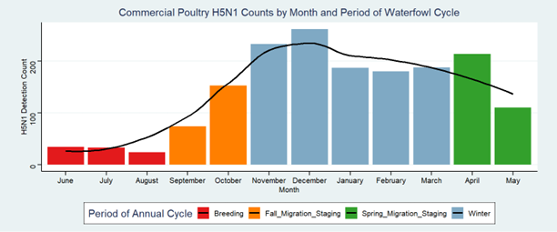 Swans follow different routes and utilize various habitats, depending on the species and geography, during their annual cycles. However, they all contribute to a shared continental picture of HPAI risk. By understanding how HPAI risk varies by flyway, species and time of the year, farmers can anticipate periods of higher threat based on migration patterns and implement targeted biosecurity measures to protect their operations (Figure 4).
